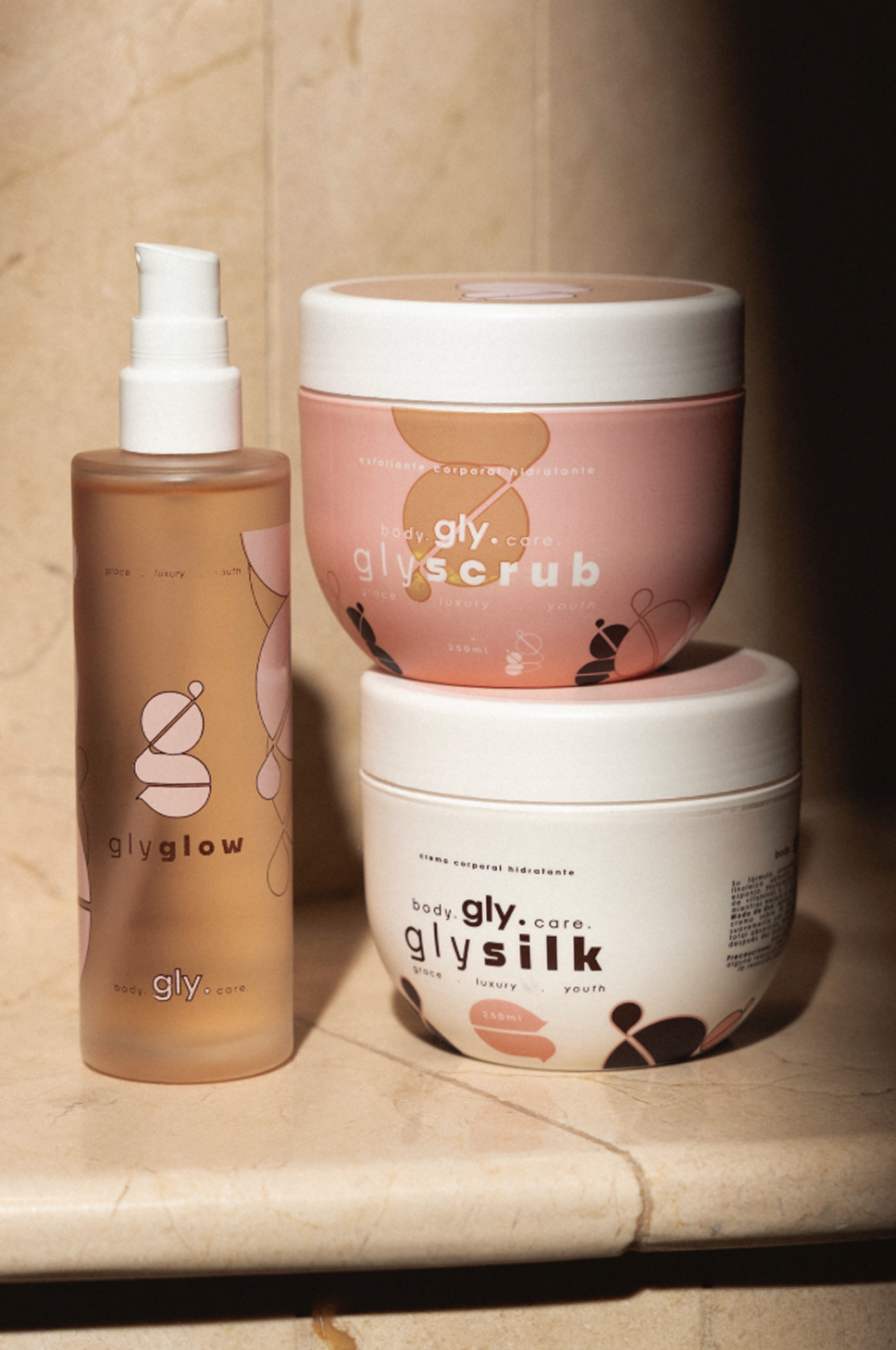 Exfoliante GlyScrub, Crema GlySilk y Aceite GlyGlow.